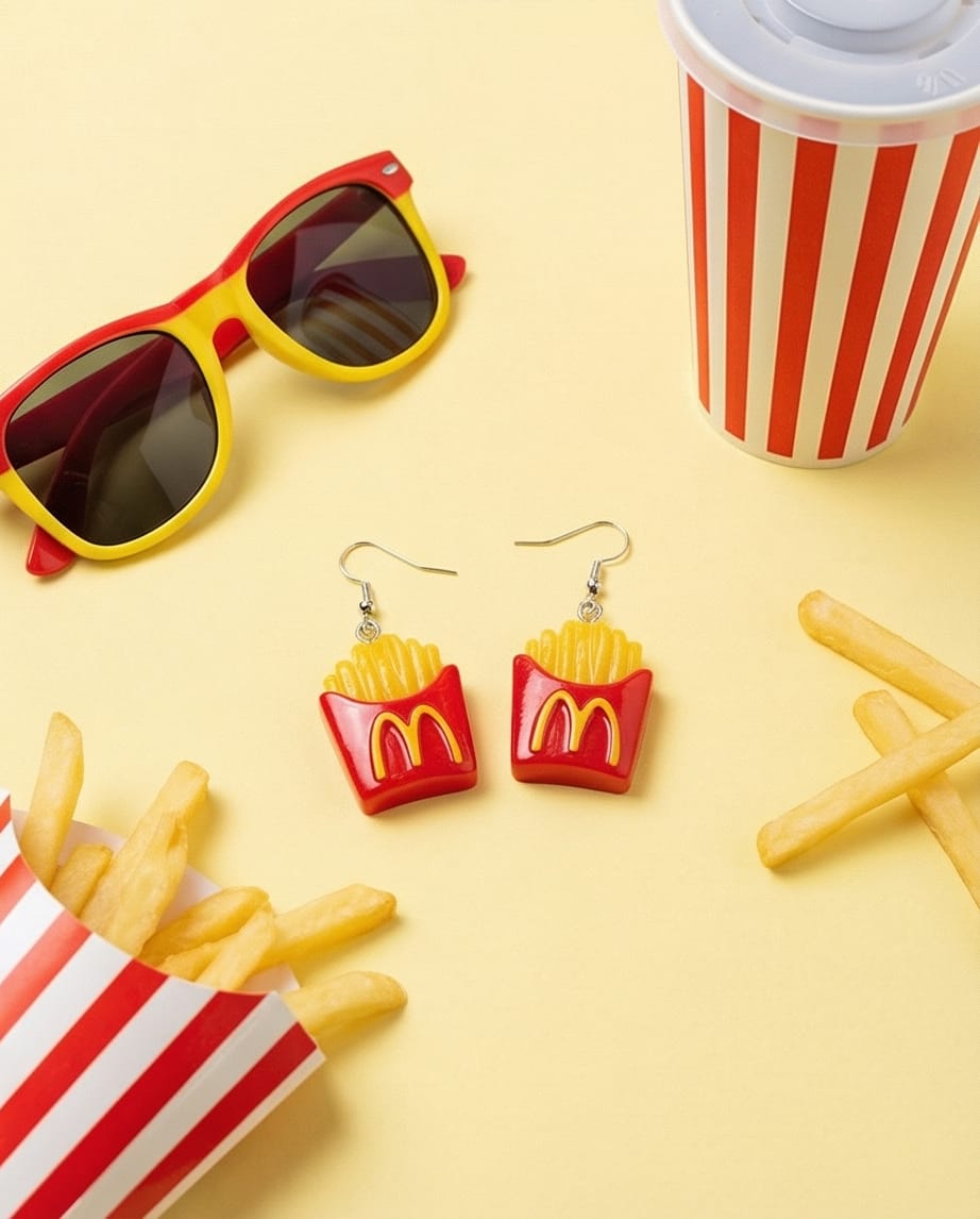 O brinco apresenta um formato de batata frita incrível, com detalhes em vermelho e amarelo que remetem aos tradicionais recipientes de fast-food. Seu tamanho é ideal para uso casual, combinando com diferentes estilos e ocasiões.