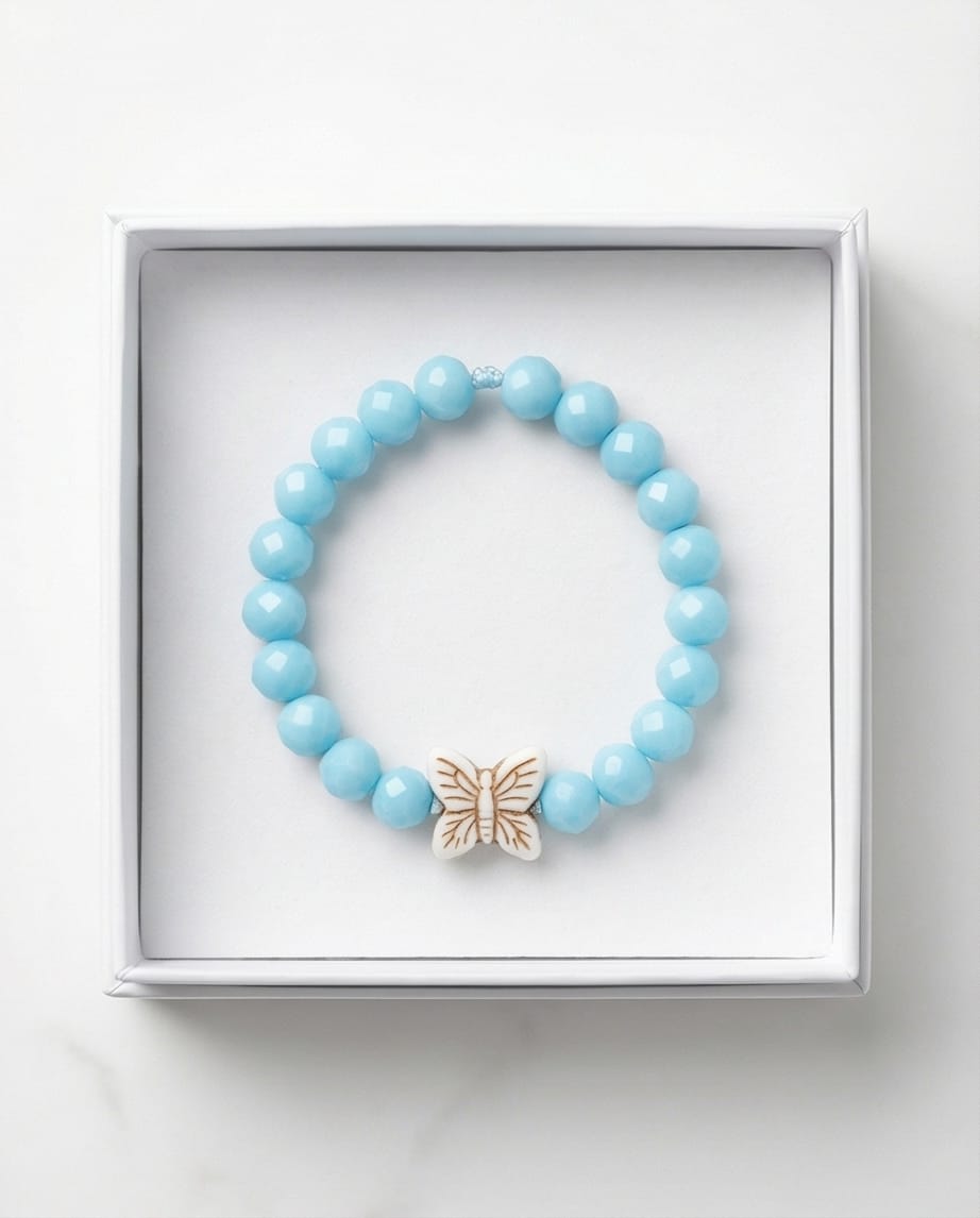 Pulseira delicada da Blessingbijoux com contas de cristal azul e detalhe em borboleta branca. Feita para dar um toque suave e elegante no seu visual.